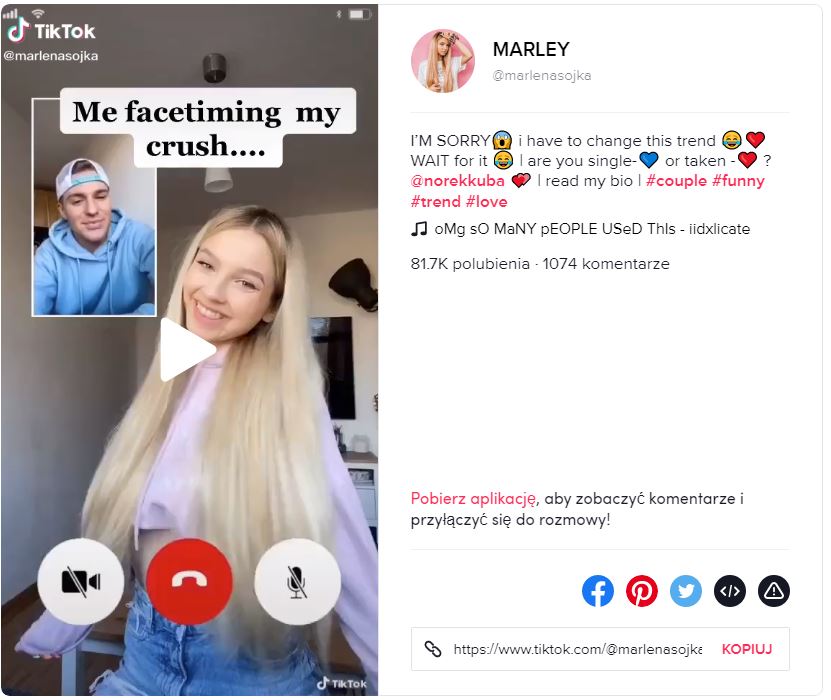 Oczywiście to nie jedyna forma lip synców pojawia się na TikTok – obok nich mamy krótkie scenki komediowe (z podłożonym głosem, własnym lub po prostu muzyką) i transition – pomysłowe filmiki, w których chodzi przede wszystkim o zgrabne przejścia osiągnięte w wyniku montażu. Jak dodamy jeszcze do tego tutoriale (np. gotowanie) i relacje live, mamy cały wachlarz różnych form filmowych, z których każdy może budować swój własny kanał – ukazujący to, co w duszy gra danemu twórcy.
