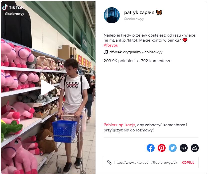 Inną kampanią wartą przytoczenia jest ta zorganizowana przez mBank i agencję VMLY&R oraz GetHero. Do współpracy zostali zaangażowanie doskonale znani użytkownikom aplikacji twórcy internetowi – Marlena Sojka, Kuba Norek, Patrycja Widera, Kamelemona, Colorowyy i Kompleksiara. W ramach promocji influencerzy na swoich kanałach komunikacyjnych opublikowali krótkie materiały wideo, które nawiązywały do korzyści płynących z usług oferowanych przez mBank. Na nagraniach widzimy jak TikTokerzy płacą za swoje zakupy za pomocą aplikacji bankowej w lodziarni i supermarkecie. Przesłanie jest takie, że płacenie za pomocą aplikacji bankowej jest szybkie i wygodne, dlatego może być skierowane dla młodych ludzi, którzy nie mają nic przeciwko wypróbowywaniu na wlasnej skórze tego typu nowoczesnych rozwiązań.