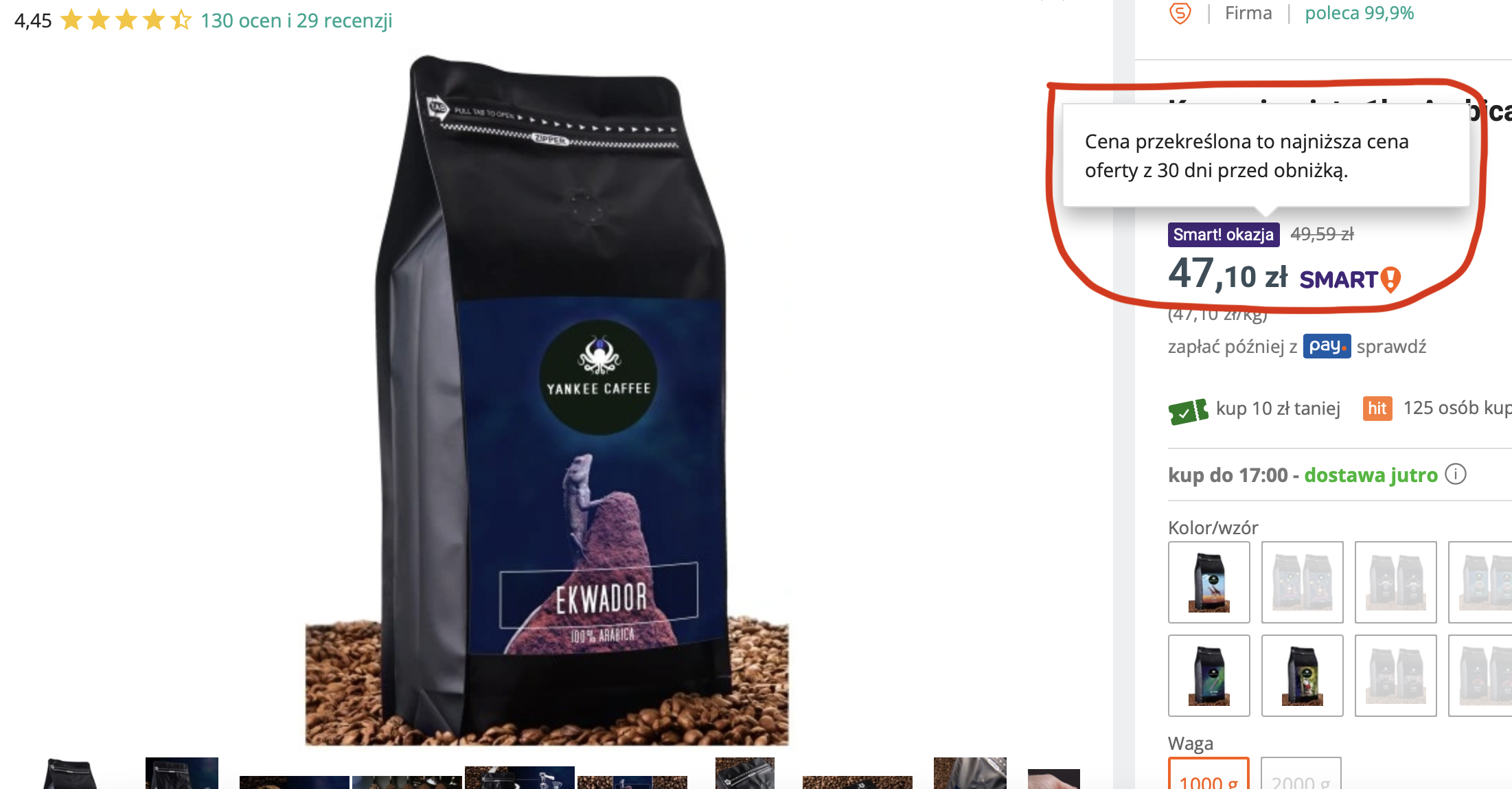 Wówczas kupujący ma pewność, że nie jest oszukiwany przez sklep, który mógł w ostatnich dniach celowo zawyżyć cenę produktu, aby teraz kusić atrakcyjnymi obniżkami i promocjami. Znajdująca się obok przekreślona cena oznacza najniższą cenę oferty z 30 dni przed obniżką i taka informacja jest najczytelniejszą i najuczciwszą informacją dla klienta.