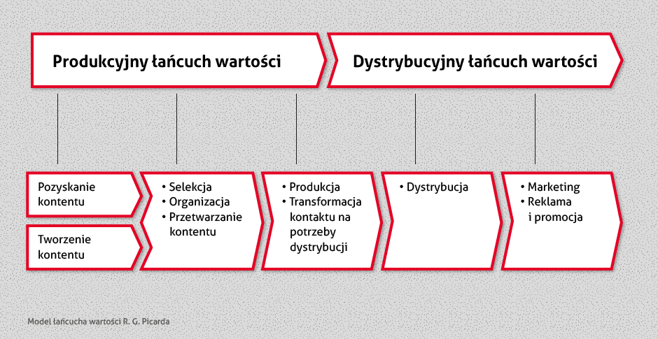 Mówią, że bywa zbędna, ale trochę teorii nie zaszkodzi. Na początek Robert Picard. To on stworzył koncepcję łańcucha wartości złożonego z części produkcyjnej i dystrybucyjnej. W obu kluczową rolę odgrywa kontent, który dla badacza jest podstawą działania przedsiębiorstw medialnych.