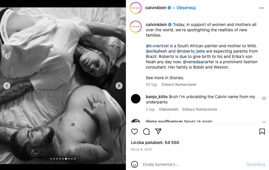 Menvertising to nurt, który naturalnie może przybierać kontrowersyjną odsłonę – w końcu daje inną perspektywę i łamie wszechobecny punkt widzenia, co nie każdemu może przypaść do gustu. Sądząc po licznych reakcjach (nie tylko tych pozytywnych) właśnie taką postać wzbudzającą kontrowersje przybrała kampania marki Calvin Klein, która z okazji Dnia Matki udostępniła wizerunek transpłciowego mężczyzny w ciąży. Cel producenta był prosty – zwrócenie uwagi na realia nowoczesnych rodzin. Calvin Klein nie ukrywa, że takie sytuacje mają miejsce i chce oswajać z tym społeczeństwo, równocześnie prezentując zupełnie inne niż do tej pory postrzeganie roli mężczyzny. Marka szerzy w ten sposób tolerancję pod każdą postacią i sama podkreśla, że toleruje wszystko oprócz nietolerancji.