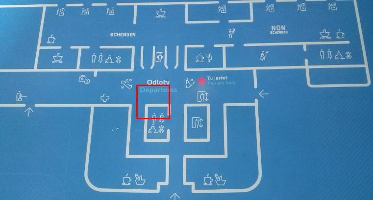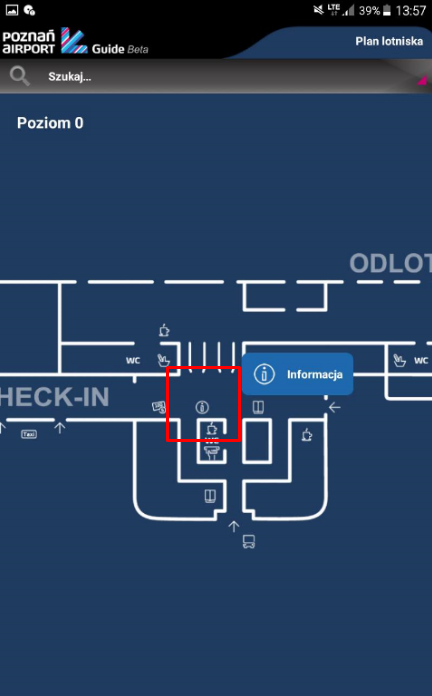 Szukając punktu informacyjnego, postanowiliśmy wykorzystać zainstalowaną chwilę wcześniej mobilną aplikację, która posiada wbudowaną mapę lotniska. Znalezienie wskazywanego przez nią punktu (zaznaczonego poniżej), okazało się jednak niemożliwe – w rzeczywistości go tam nie ma. Pokazywanie nieistniejących miejsc to tylko jeden z problemów występujących podczas korzystania z aplikacji. Chociaż analiza jej użyteczności to temat na kolejny artykuł, pierwszym pozytywnym krokiem byłoby z pewnością zweryfikowanie znajdujących się w niej informacji.