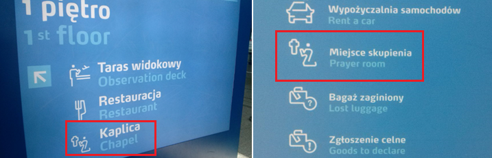 Wraz z rozbudową terminala w 2012 roku, postanowiono zmienić także całą identyfikację wizualną lotniska. Pojawiła się więc nowa kolorystyka, nowe logo i nowy wizerunek. Rzeczywiście, wszystko ze sobą współgra i wydaje się być dobrze dopasowane. Jednak i w tym wypadku pojawiły się drobne nieścisłości. Przechodząc przez lotnisko zastanawialiśmy się nad różnicą pomiędzy ‘Kaplicą’ (ang. Chapel), a ‘Miejscem skupienia’ (ang. Prayer room). Pomijając kwestie językowe, ciągle niejasne było to, czym mogą się różnić. Może przeznaczone są dla wyznawców różnych religii? W każdym razie, okazało się, że ‘Miejsce skupienia’ oraz ‘Kaplica’ to jedno i to samo pomieszczenie. Taka niespójność wprowadza w błąd pasażera, może go denerwować i znacznie wydłużać czas konieczny na osiągnięcie celu. Jedną z głównych heurystyk jest trzymanie się standardów oraz zachowanie spójności komunikatów – nazwy powinny zostać więc ujednolicone, tak by we wszystkich materiałach informacyjnych znajdowała się taka sama nomenklatura.