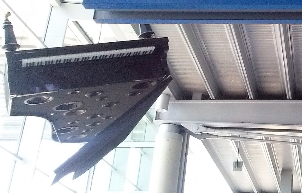 Zdjęcie: Fortepian zawieszony pod sufitem; Źródło: Materiały własne