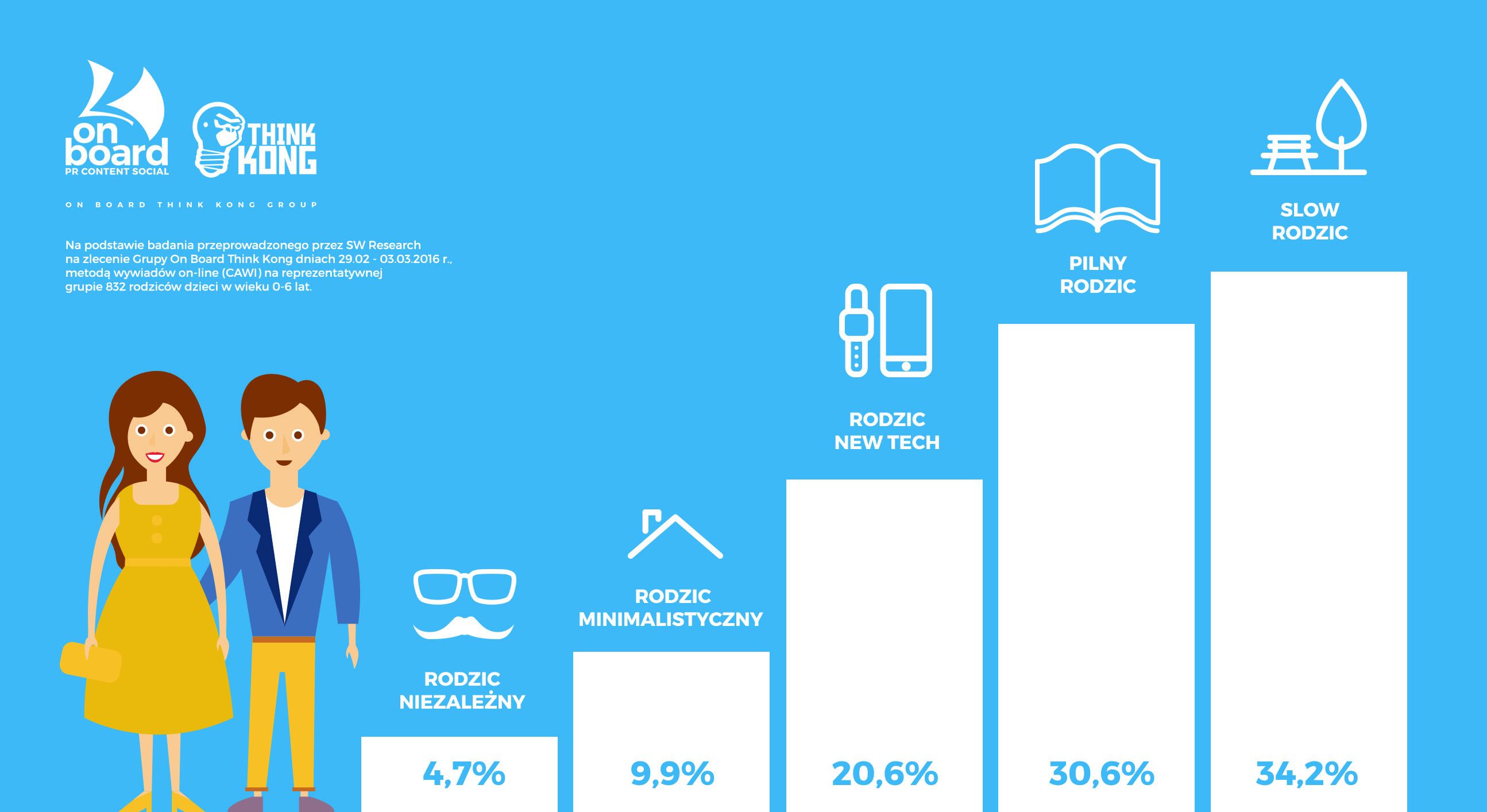 Według badania Grupy On Board Think Kong przeprowadzonego przez SW Research pt.: „Czy nowe technologie wychowują dzieci Millenialsów? Rodzic konsument. Postawy i priorytety”1, co piąty Polak należy do grupy Rodziców New Tech. To segment, który najczęściej wykorzystuje nowe technologie w wychowywaniu dzieci. Aż 57% Rodziców New Tech korzysta z aplikacji mobilnych związanych z rodzicielstwem (m.in. z internetowych porównywarek cenowych), a 84% interesuje się nowinkami i gadżetami.
