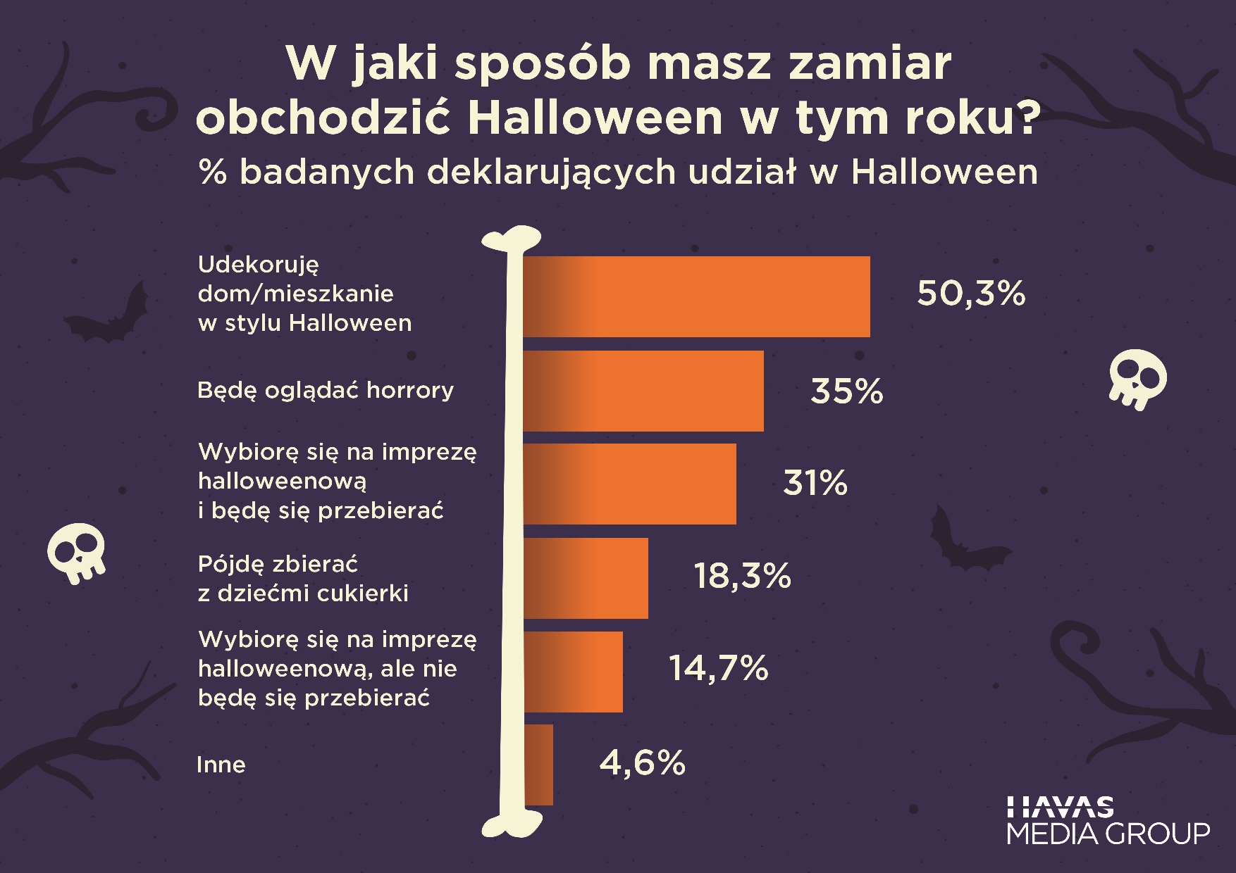 Najpopularniejszą formą obchodzenia Halloween jest udekorowanie swojego domu lub mieszkania – zrobi to co 2. osoba aktywnie biorąca udział w Halloween. Część osób spędzi ten dzień oglądając horrory lub wybierze się na imprezę tematycznie powiązaną z tym dniem. Niecałe 20% Polaków będzie także towarzyszyć swoich dzieciom zbierającym cukierki.