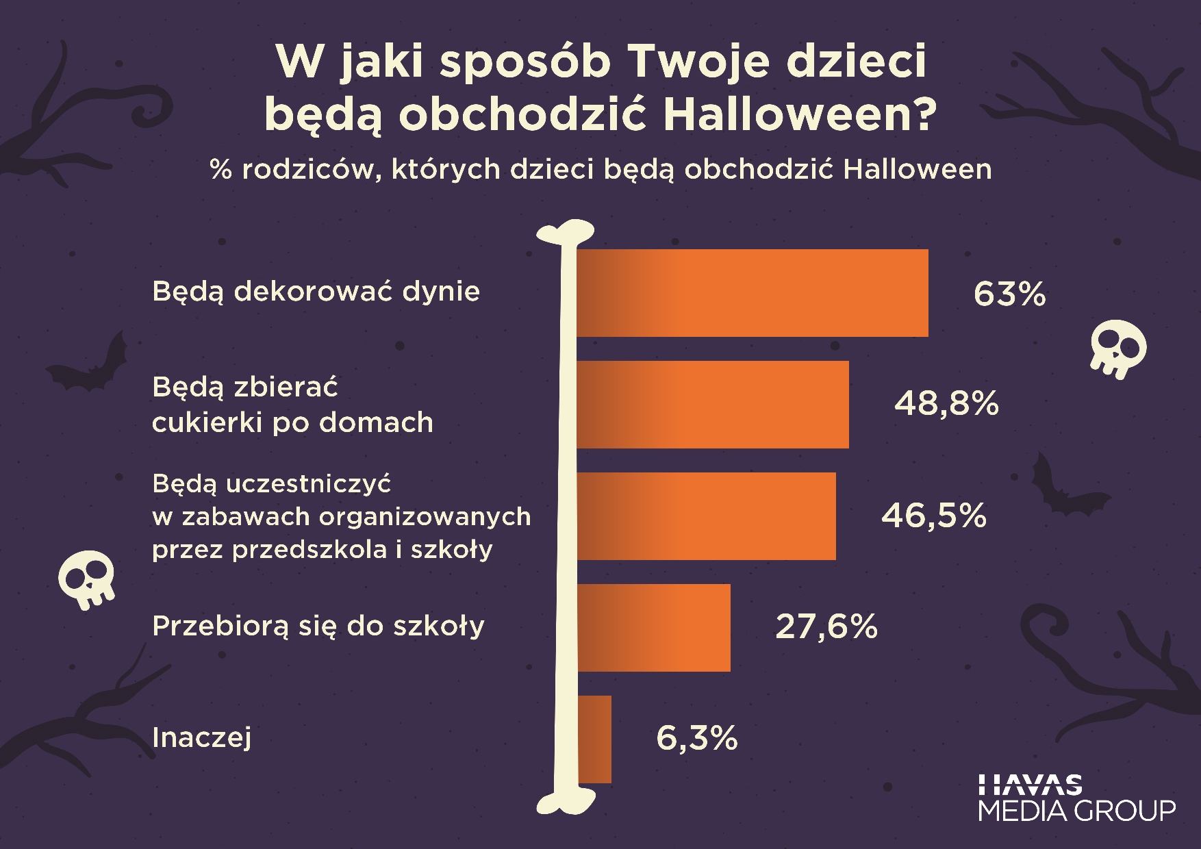 Mimo że, spory odsetek Polaków widzi w swoim najbliższym otoczeniu dzieci obchodzące Halloween, to zaledwie 17,6% rodziców deklaruje, że ich dzieci biorą aktywny udział w różnych zabawach związanych z tym dniem. Najpopularniejszą formą celebrowania Halloween jest wycinanie i dekorowanie dyni – wskazuje na to ponad 60% rodziców dzieci, obchodzących Halloween. Trochę mniej niż połowa rodziców wskazuje, że ich dzieci będą w tym dniu zbierać cukierki lub wezmą udział w zabawach halloweenowych organizowanych przez przedszkola lub szkoły.