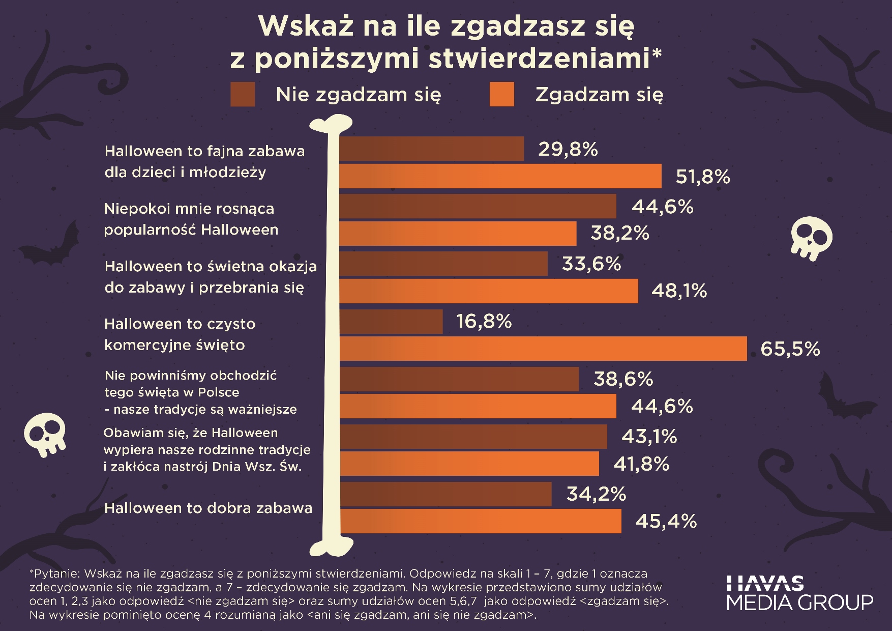 Dla 44,6% Polaków rosnąca popularność Halloween w Polsce to zjawisko neutralne – nie ma dla nas ani pozytywnego, ani negatywnego wydźwięku. Odbieramy ten dzień przede wszystkim jako dobrą zabawę (45,4%) i świetną okazję do zabawy i przebrania się – spędzenia tego dnia w inny niż zazwyczaj sposób (48,1%). Jednakże pomimo tego, że przez wielu Polaków Halloween oceniane jest w kategoriach czysto rozrywkowych, to widzimy także jego wady. Dla większości z nas dzień ten ma czysto komercyjny wymiar – dostrzegamy, że jest to kolejna okazja dla sklepów i marek, które chcą w ten sposób zwiększyć swoją sprzedaż. Część Polaków jest również zdania, że nie powinniśmy obchodzić tego święta – celebrowanie rodzimych tradycji związanych z dniem Wszystkich Świętych i Zaduszkami powinno być dla nas znacznie ważniejsze. Trudno jednak jednoznacznie stwierdzić czy Polacy obawiają się popularyzacji Halloween. W naszym badaniu 41,8% dorosłych Polaków wskazało, że obawia się, że Halloween wypiera nasze rodzime tradycje i zakłóca nastrój dnia Wszystkich Świętych. Obaw takich nie posiada 43,1% badanych.