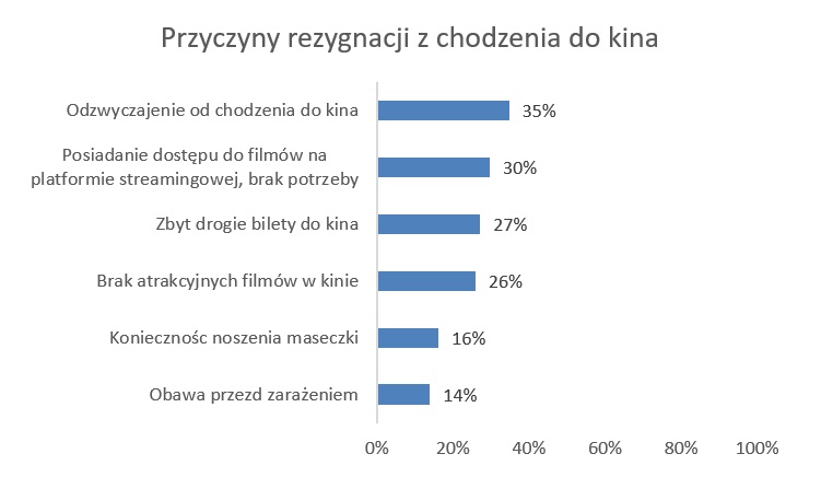 Trzy główne przyczyny to odzwyczajenie, korzystanie z platform streamingowych oraz zbyt drogie bilety. Niektórzy zwracają również uwagę na brak atrakcyjnych filmów i kwestie związane z COVID-19, czyli wcześniejszą konieczność noszenia maseczek i na obawę przed zarażeniem.