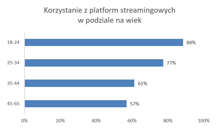 Z platform streamingowych korzystają respondenci w zasadzie w każdym wieku (badane były osoby od 18 do 65 roku życia). Im młodsi respondenci, tym korzystanie z platform wzrasta.