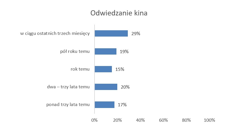 Tylko 29% Polaków przyznaje, że w ciągu ostatnich trzech miesięcy była w kinie, znacznie wyższy jest odsetek tych, którzy w kinie nie byli w ciągu ostatniego roku (52%). Do kina stosunkowo najczęściej chodzą ludzie młodzi (od 18 do 24 lat) – 39% respondentów z tej grupy wiekowej deklaruje, że było w kinie w ciągu ostatnich trzech miesięcy do momentu realizacji badania.