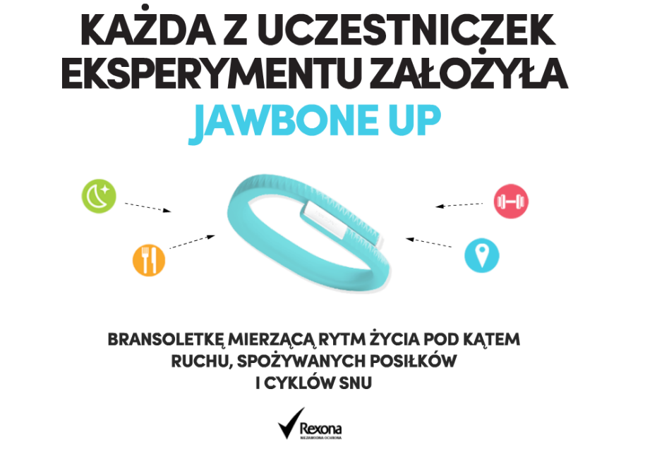 Każda z pań, biorących udział w badaniu, otrzymała nowoczesną bransoletkę JAWBONE UP, która mierzy aktywność fizyczną organizmu w ruchu, przy jedzeniu, a nawet we śnie. Dzięki specjalnej aplikacji na smartphone’a rejestruje bilans energetyczny organizmu. Dzięki temu możemy jasno określić jak bardzo aktywna w ciągu doby była każda z uczestniczek badania – ile energii wydatkowała na poszczególne czynności, jak zregenerowała organizm podczas snu.