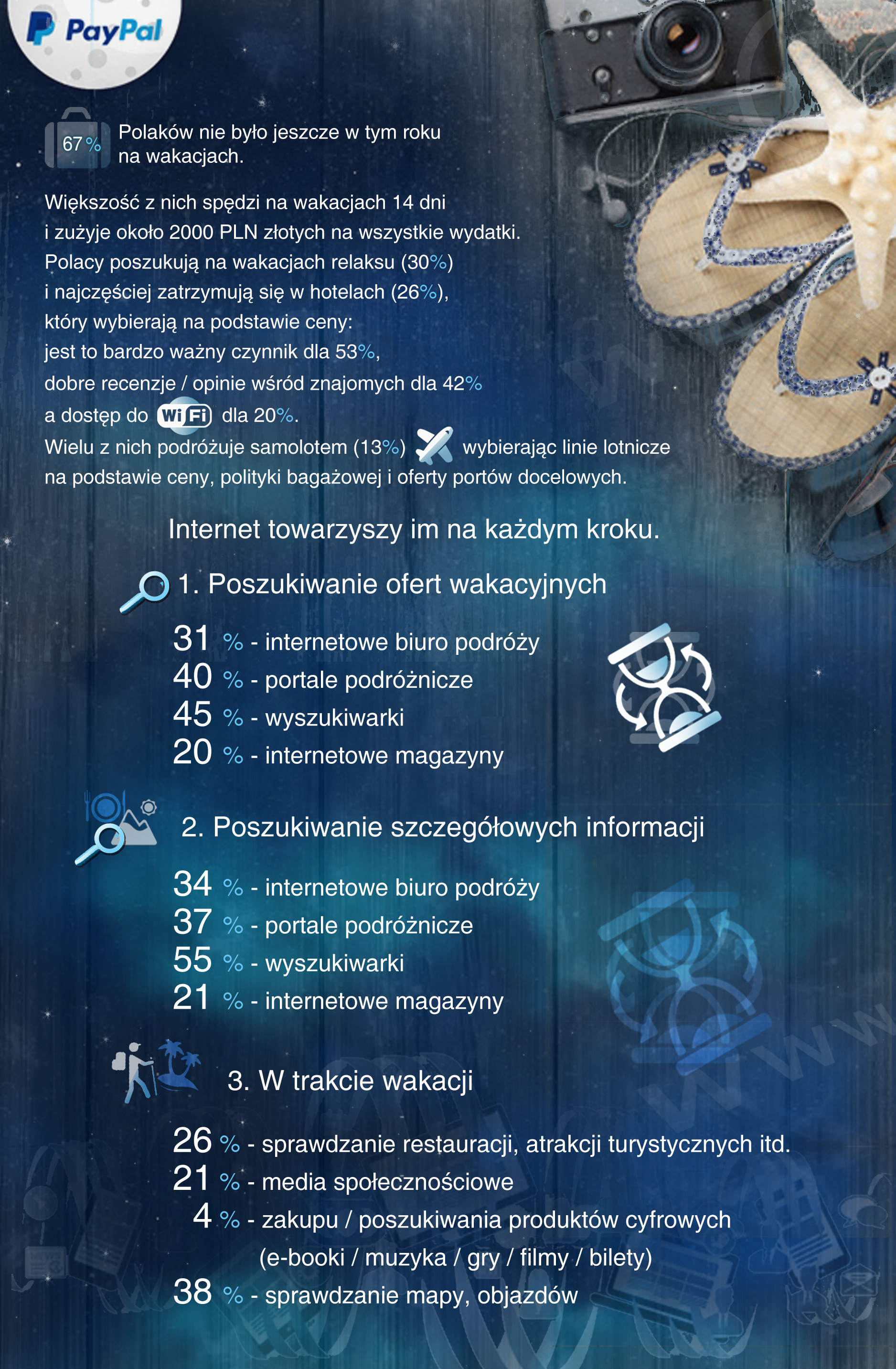 Najpopularniejszym sposobem płatności na wakacjach (zarówno przed, jak i w trakcie pobytu) jest gotówka (47%) oraz karty kredytowe (25%). Jednocześnie, 20% Polaków wykorzystuje do pokrycia wakacyjnych wydatków system PayPal, a 24% które jeszcze tego nie robiło, rozważa jego użycie w przyszłości. Popularność serwisu w trakcie podróży można tłumaczyć nie tylko wygodą I bezpieczeństwem, ale także dostępnością na całym świecie.