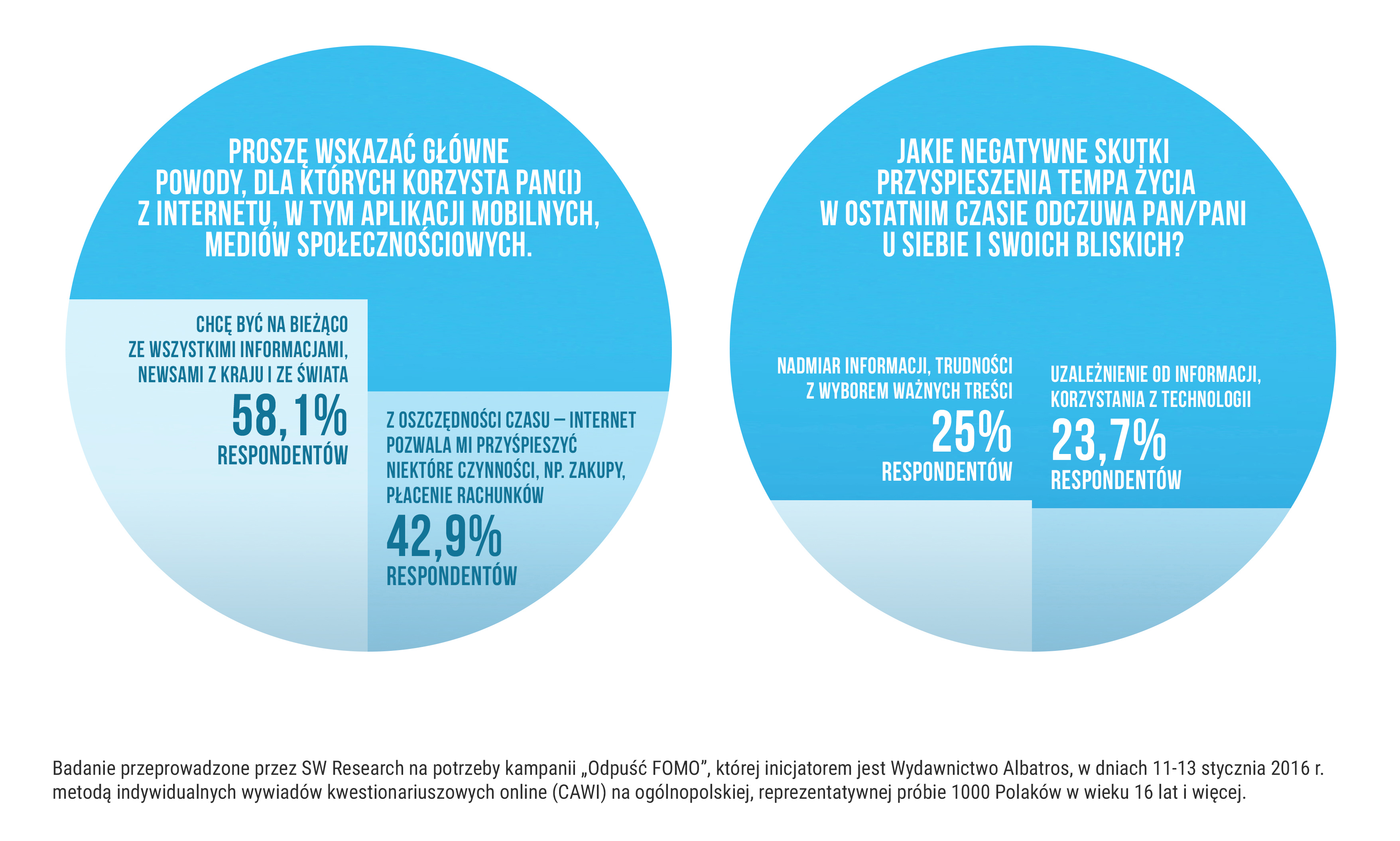 Wśród Polaków, którzy odczuwają przyspieszenie tempa życia, co czwarty twierdzi, że jest uzależniony od informacji oraz odczuwa ich nadmiar, dodatkowo ma problem z wyborem istotnych treści. Odbieramy coraz więcej informacji, a korzystając intensywnie z Internetu, w tym z mediów społecznościowych – pisząc posty, wstawiając zdjęcia, komentując – sami przyczyniamy się do tworzenia natłoku komunikatów. Chcąc być na bieżąco ze wszystkimi informacjami, zaczynamy traktować je coraz bardziej powierzchownie. W innym przypadku mamy poczucie, że coś nas ominie. FOMO (od ang. Fear Of Missing Out – lęk przed tym, że coś nas ominie) staje się chorobą cywilizacyjną naszych czasów.