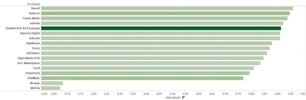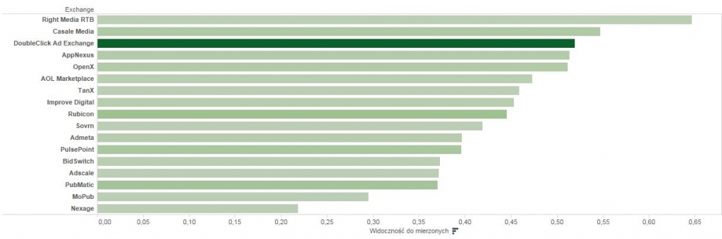 Pierwsza rzecz – to mierzalność, czyli czy w ogóle wyświetlenia reklam zostały zmierzone. I tutaj wynik skumulowany to 90 proc. Czyli w 90 proc. emisji system miał możliwość zmierzyć czy reklama była widoczna. Druga sprawa to jak z pomiarem radzą sobie poszczególne Exchange. Najlepiej wypada OpenX, potem Rubicon. Od AppNexus w dół – liczba zmierzonych odsłon jest poniżej średniej. Im ciemniejszy pasek – tym więcej odsłon. Z tej perspektywy warto zwrócić uwagę na słaby wynik PubMatic – tylko 3/4 zmierzonych odsłon, przy stosunkowo dużym wolumenie.