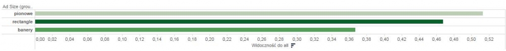 Uwzględniając formaty zdecydowanie najlepiej wychodzą formaty pionowe (sky, halfpage). Generalnie jest to zgodne z podanymi jakiś czas temu wynikami analizy Google. Formaty prostokątne – mniej więcej w okolicy średniej. Najgorzej – formaty tradycyjnie najpopularniejsze, czyli bannerowe (od 468×60 do 750×200).