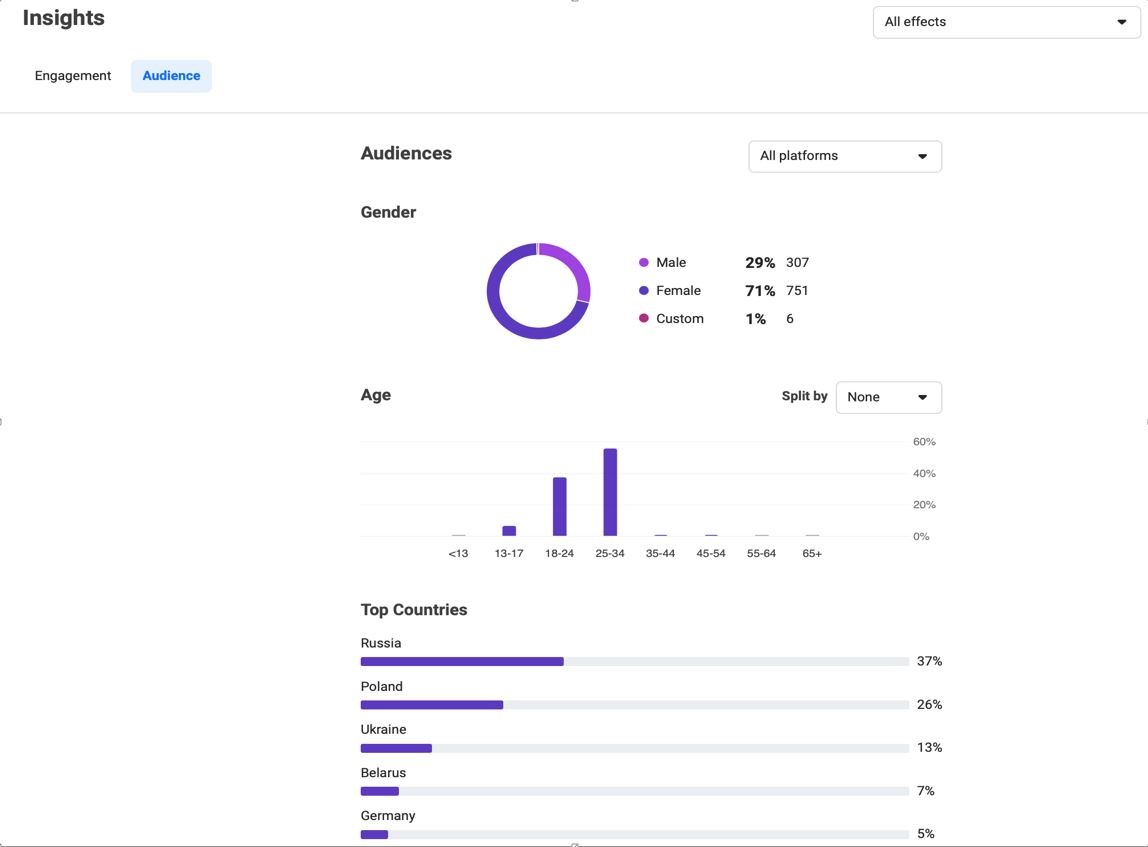 Jeśli chodzi o KPI w przypadku filtrów AR, to najważniejszymi statystykami są impresje oraz liczba udostępnień, ponieważ dzięki nim widzimy realny zasięg oraz liczbę unikalnych użytkowników, którzy zostali ambasadorami naszego filtru, poprzez jego udostępnienie. Dodatkowo uzyskamy informację na temat płci, wieku i lokalizacji odbiorców.