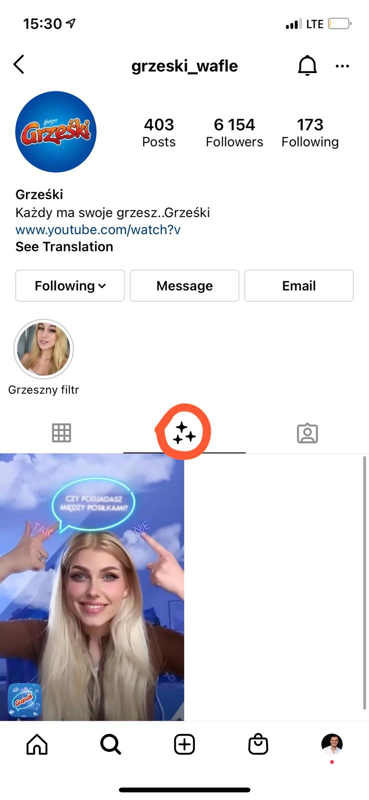 Aby zobaczyć, czy dany profil marki na Instagramie udostępnia efekty, maski (filtry AR twarzy), po wejściu na niego należy sprawdzić, czy wyświetla się ikonka z gwiazdkami.