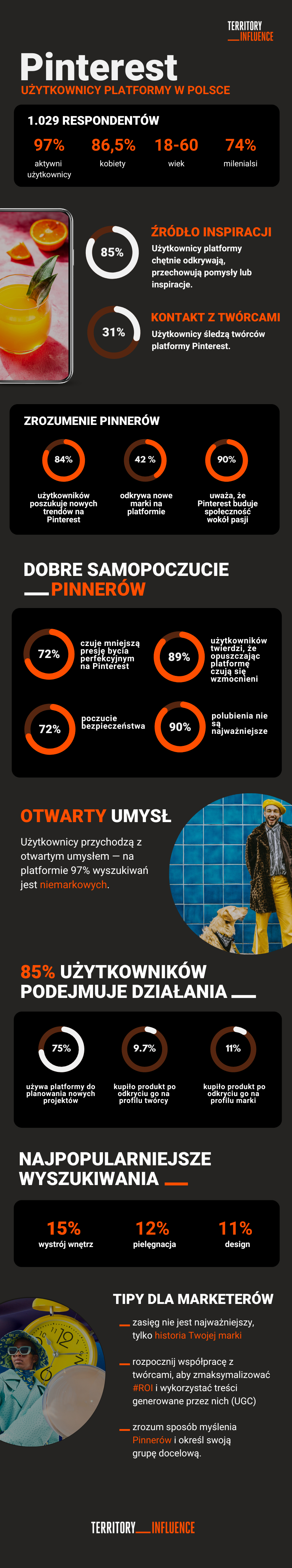 Pinterest jest prawdopodobnie jedną z najmniej niedocenianych platform mediów społecznościowych w Polsce. Mimo mniejszej popularności od Instagrama Facebooka itp., użytkownicy w Polsce stanowią prawie 4 mln. Agencja TERRITORY Influence chciała poznać potrzeby i zachowania użytkowników platformy tak zwanych Pinnerów i przeprowadziła na nich szeroko zakrojone badania.