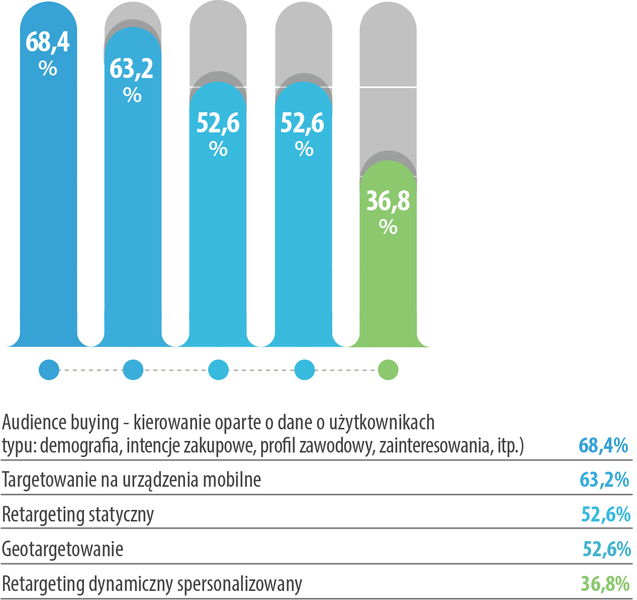 • Najpopularniejsze metody targetowania: audience targeting/buying (68,4%), targetowanie na urządzenia mobilne (63,2%), geotargetowanie i retargeting statyczny (po 52,6%).