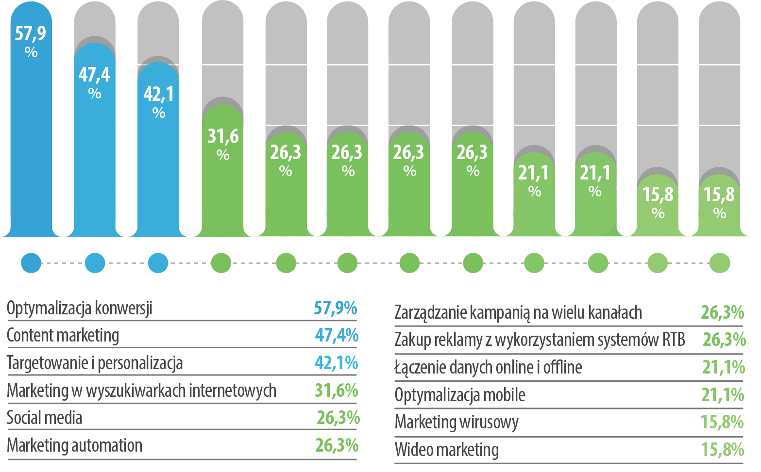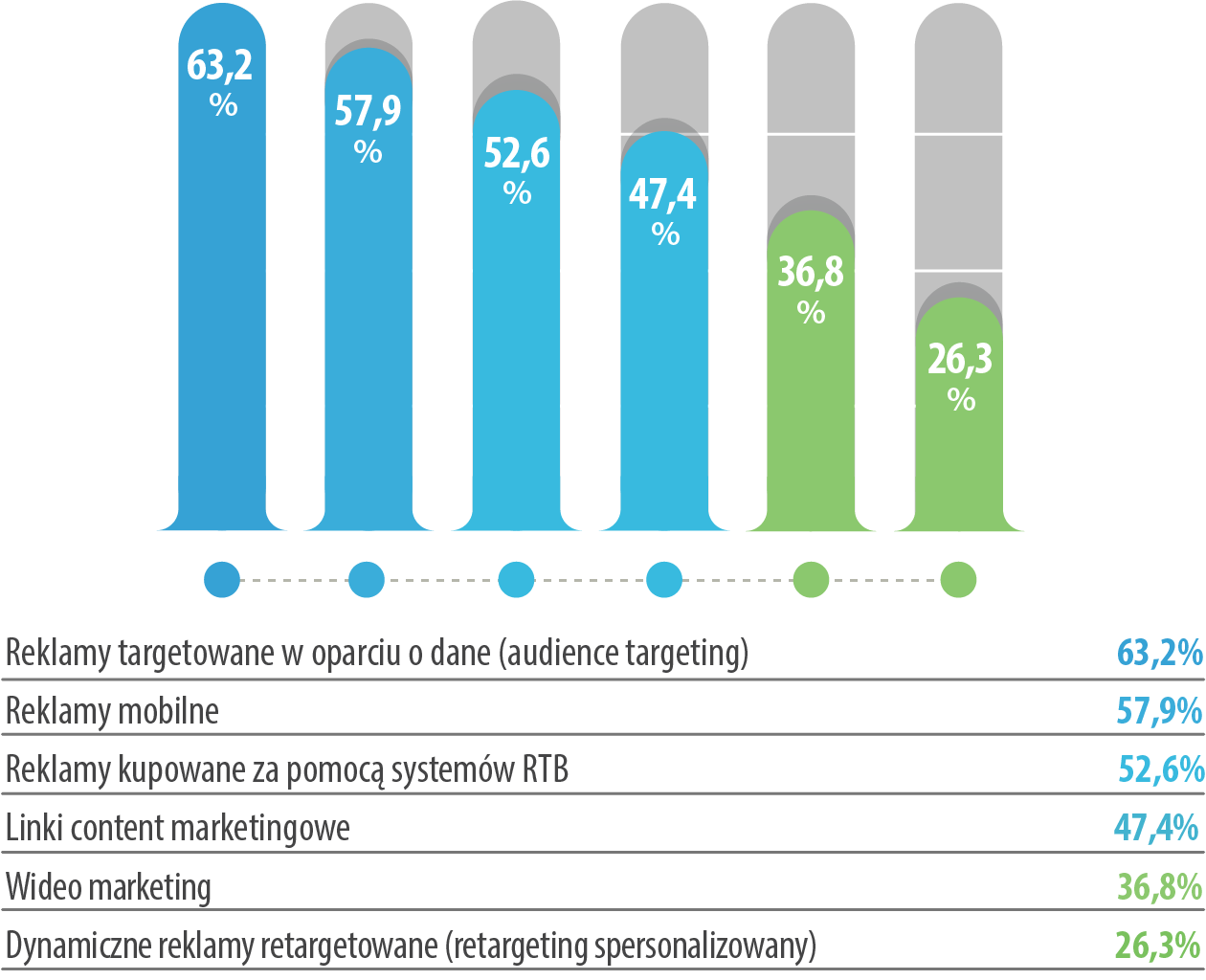• Wykorzystanie nowych produktów: reklamy targetowane w oparciu o dane (63,2%), reklamy mobilne (57,9%), reklamy kupowane za pomocą systemów RTB (52,6%), linki content marketingowe (47,4%).