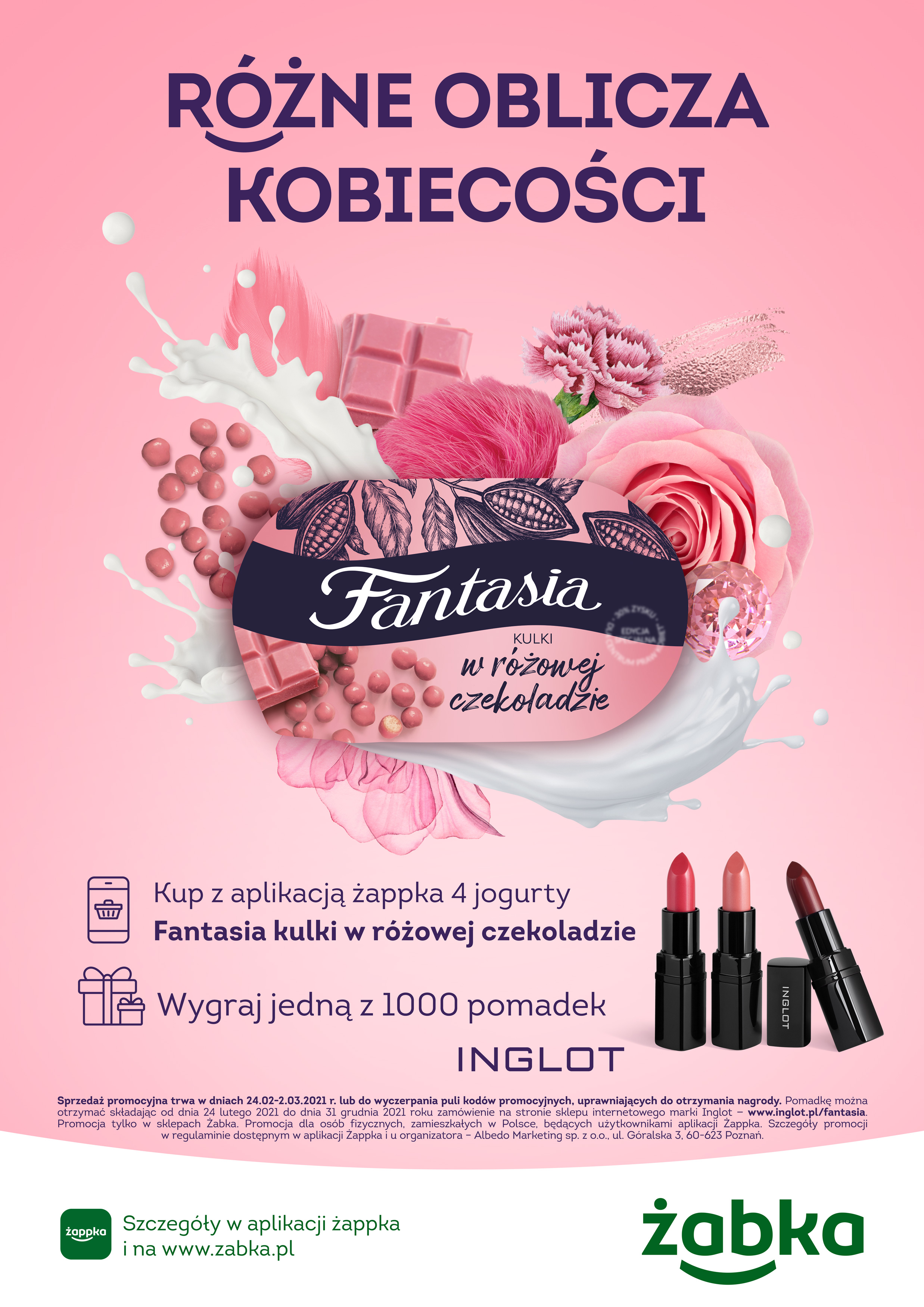 Akcja „Różne oblicza kobiecości” ruszyła 24 lutego i była realizowana wyłącznie w sklepach sieci Żabka. Celem było wsparcie nowego produktu Danone Fantasia z różową czekoladą. Za zakup 4 sztuk premiowanego produktu za pośrednictwem aplikacji Żappka klientka otrzymywała kod na pomadkę marki Inglot w wybranym kolorze oraz voucher zniżkowy na kolejne zakupy w sklepie Inglot. Marka planowała pierwotnie wydać 1000 pomadek, jednak ogromne zainteresowanie akcją sprawiło, że już pierwszego dnia zadecydowano o zwiększeniu puli nagród do 2000 sztuk. Mimo podwojenia, pula błyskawicznie się wyczerpała, kończąc akcję raptem 3 dni od startu.