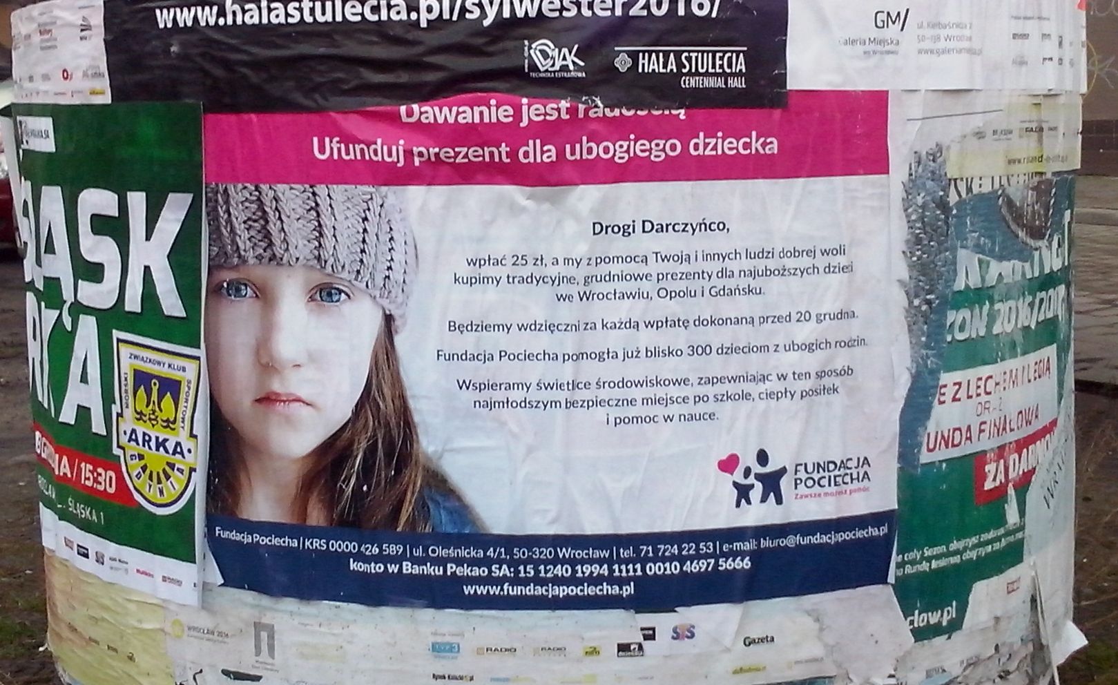 Tegoroczna kampania „Dawanie jest radością” trwa od 21 listopada do 20 grudnia. W ubiegłym roku darczyńcy ufundowali prezenty dla wychowanków ze świetlic środowiskowych z Wrocławia, Opola, Gdańska i Lidzbarka Warmińskiego. W tym roku Fundacja Pociecha pragnie ponownie sprawić radość najmłodszym.