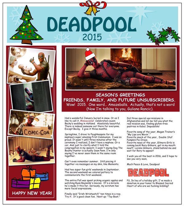 14 grudnia 2015 ruszyła specjalna kampania „12 Days Of Deadpool”, podczas której do fanów codziennie trafiały kolejne porcje ciekawego i śmiesznego contentu, dotyczącego głównego bohatera. Wśród nich pojawiło się specjalne, świąteczne video z Deadpoolem w roli głównej: