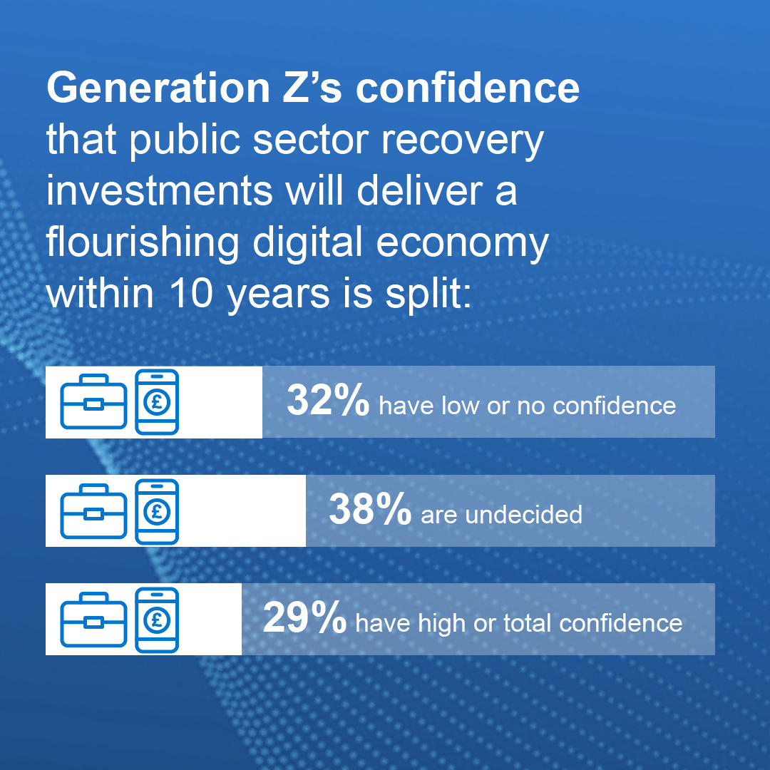 Zaufanie pokolenia Z dotyczące tego, że inwestycje skupione na ożywieniu sektora publicznego przyniosą rozkwit gospodarki w perspektywie 10 lat jest podzielone: jedna trzecia ich przedstawicieli na całym świecie (32%) wyraża niskie zaufanie lub w ogóle jego brak, podczas gdy 38% jest niezdecydowanych, a 29% wyraża wysokie bądź pełne zaufanie.