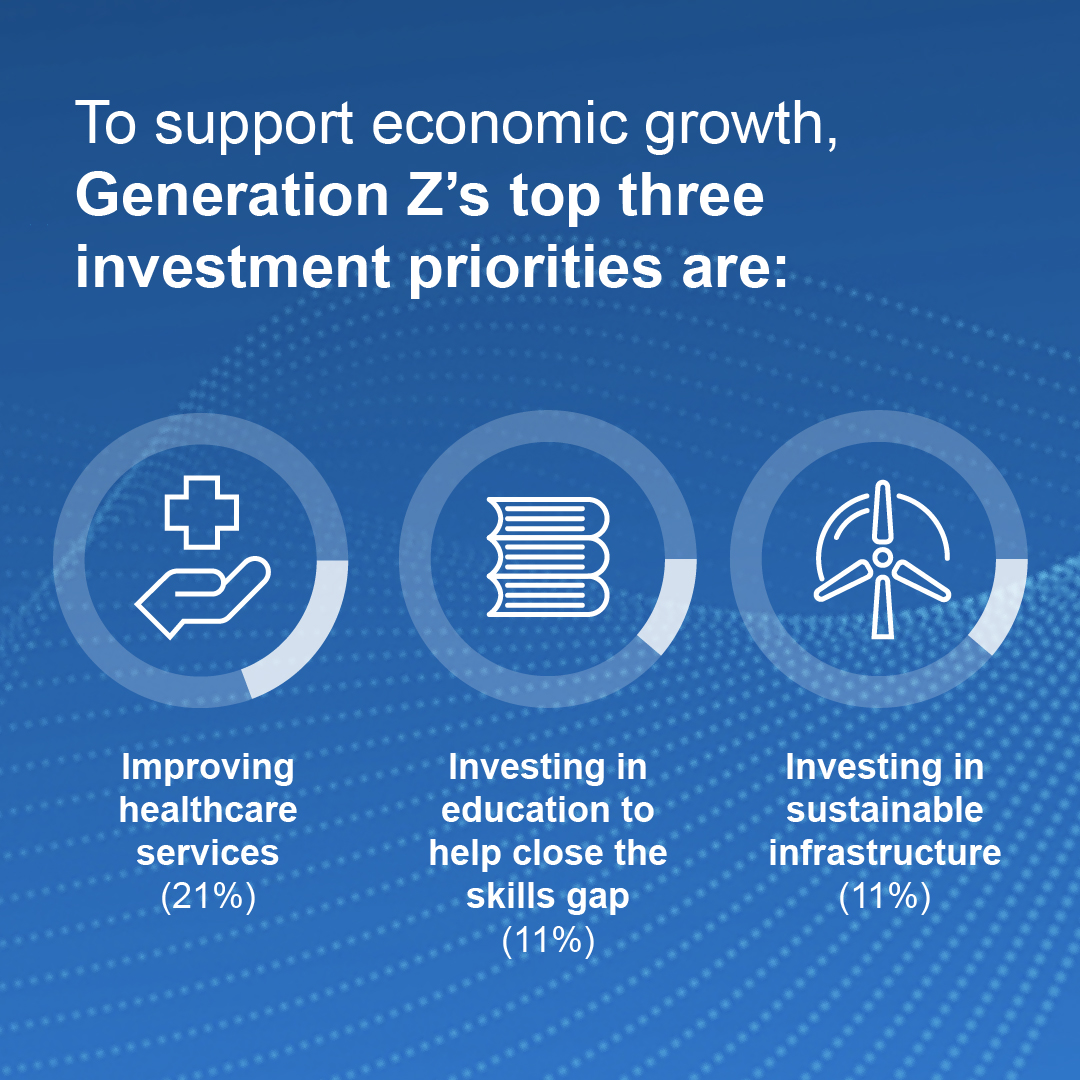 Wspieranie wzrostu gospodarczego, poprawa świadczeń opieki zdrowotnej (21%), inwestowanie w edukację w celu wyeliminowania luki w umiejętnościach (11%) oraz inwestowanie w zrównoważoną/ekologiczną infrastrukturę (11%) to trzy najważniejsze priorytety wskazane przez pokolenie Z na całym świecie