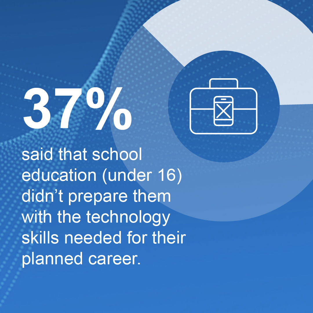 Ankietowani czują, że w trakcie edukacji można było ich lepiej przygotować w kwestii kompetencji cyfrowych. Ponad dwie piąte respondentów (44%) twierdzi, że w szkole nauczono ich jedynie bardzo podstawowych umiejętności komputerowych, a około jednej dziesiątej (12%) nie przekazano żadnej wiedzy w zakresie technologii ani kompetencji cyfrowych. Ponad jedna trzecia (37%) uważa, że szkoła (poniżej 16. roku życia) nie przygotowała ich w zakresie umiejętności technologicznych potrzebnych w planowanych przez nich zawodach.
