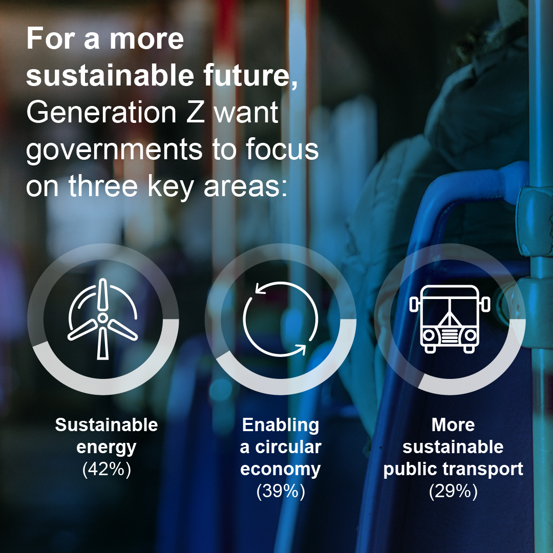 Wielu przedstawicieli pokolenia Z jest gotowych zaakceptować krótkoterminowe ograniczenia ekonomiczne; uznają oni zrównoważoną energię (42%), umożliwienie wdrożenia modelu gospodarki o obiegu zamkniętym (39%) i bardziej zrównoważony transport publiczny (29%) za trzy najważniejsze obszary inwestycyjne, które rządy powinny traktować priorytetowo. Jedna czwarta respondentów (25%) wyraża również poparcie dla zwiększenia edukacji obywateli na temat zrównoważonego rozwoju.