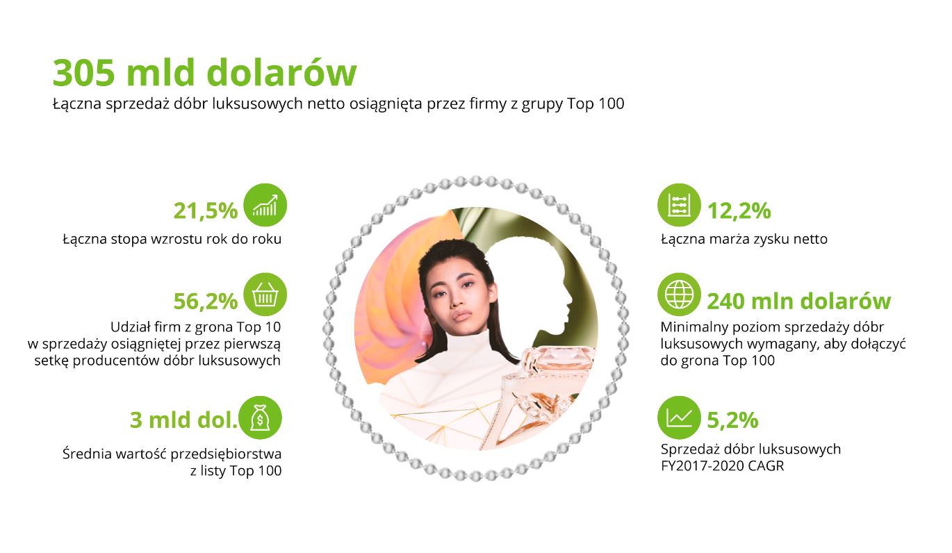 Przychody ze sprzedaży 100 największych firm z sektora dóbr luksusowych wyniosły w minionym roku obrotowym 305 mld dolarów. To aż o 21,5 proc. więcej niż rok wcześniej. Złożona marża zysku netto za 2021 rok dla 78 firm z pierwszej setki, które odnotowały zysk netto, wzrosła ponad dwukrotnie do 12,2 proc. rok do roku. Jest to wynik lepszy niż ten osiągany przed pandemią.
