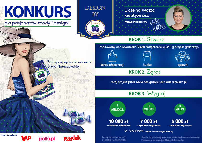 Zadaniem uczestników będzie opracowanie spójnych graficznie projektów nadruku na kubek, płócienną torbę i apaszkę, inspirowanych projektem opakowania Śliwki Nałęczowskiej 350 g. Zgłoszenia można nadsyłać od 1 marca do 30 kwietnia br. za pośrednictwem strony internetowej www.designbysliwkanaleczowska.pl.