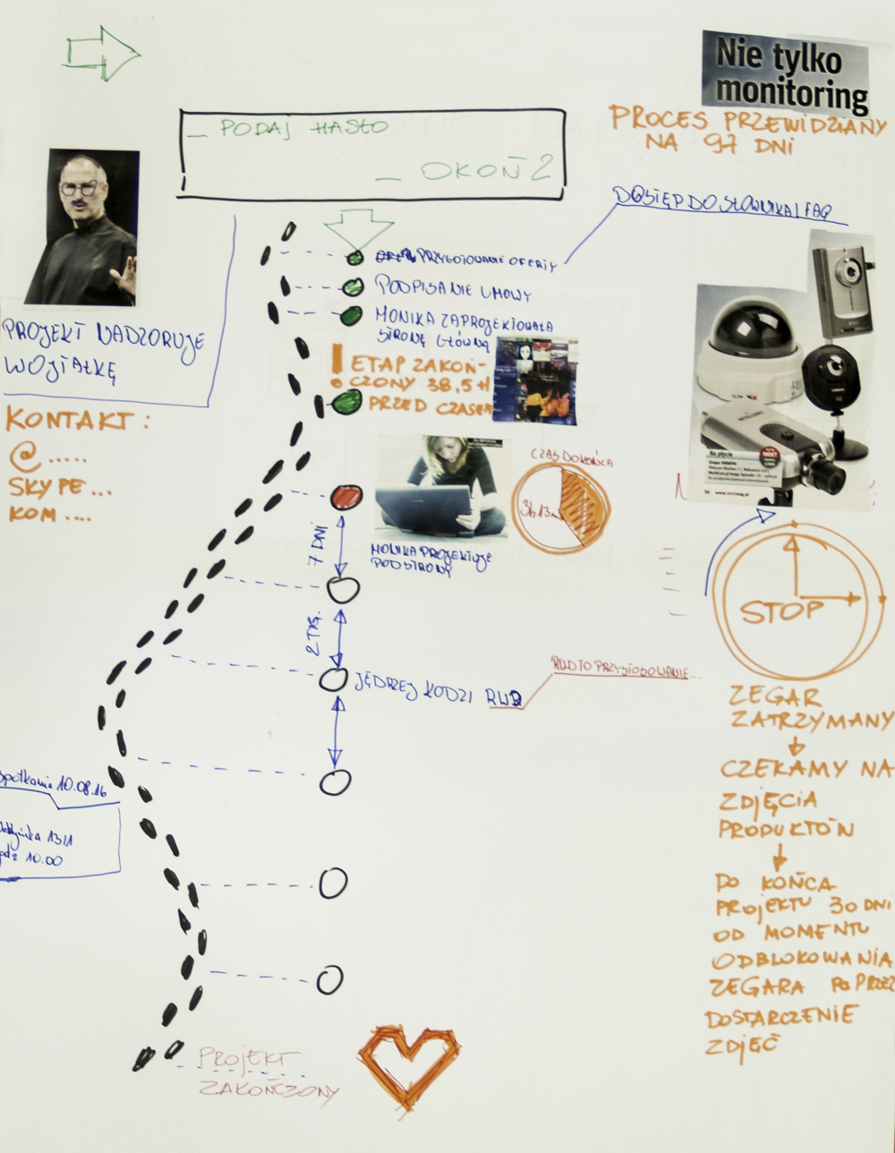 Pierwszy prototyp flow aplikacji służącej do śledzenia postępów prac nad stroną www, która ma niwelować niepokój klientów oczekujących na realizację ich projektu