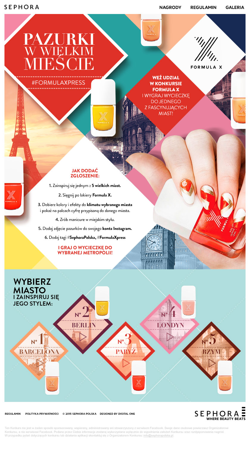 Idea konkursu „Pazurki w Wielkim Mieście” oparta jest na wykorzystaniu Instagramu i Facebooka. Nagrodami głównymi są wycieczki dla dwóch osób do jednej z europejskich metropolii, wskazanych przez zwycięzcę konkursu. Można wybierać spośród pięciu miast: Barcelony, Berlina, Londynu, Paryża i Rzymu. Rozdanych zostanie pięć nagród głównych. Nagrodami pocieszenia, dla wyróżnionych, będą zestawy lakierów do paznokci marki Formula X.