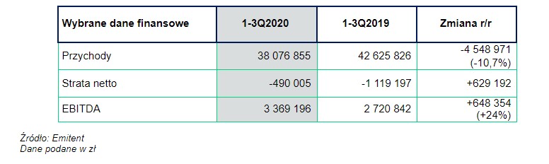 Wypracowana przez Grupę EBITDA była znacznie wyższa od ubiegłorocznej i uplasowała się na poziomie 3,4 mln zł (+ 0,6 mln zł tj. +24% r/r). Jednocześnie skonsolidowane przychody spadły o 10,7% i wyniosły 38 mln zł.