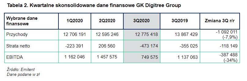 Tabela 2. Kwartalne skonsolidowane dane finansowe GK Digitree Group