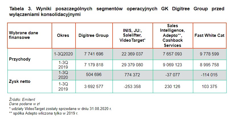 W segmencie I, do którego należy Digitree Group S.A., ponownie odnotowany został wzrost poziomu przychodów (o 8% r/r przed wyłączeniami konsolidacyjnymi), co związane jest ze stabilną pozycją usług świadczonych przez tę spółkę. Należą do nich zwłaszcza rozwiązania z zakresu e-mail marketingu oraz marketing automation, które obecnie cieszą się szczególnym zaufaniem klientów. Podobnie stało się w przypadku segmentu Fast White Cat. Spółka ta wypracowała w trzech kwartałach 2020 roku wzrost na poziomie przychodów wynoszący 9% r/r (przed wyłączeniami konsolidacyjnymi). Stało się tak pomimo nieco słabszego trzeciego kwartału, który był spowodowany charakterystycznym dla tej spółki cyklem biznesowym, związanym z realizacją wielomiesięcznych wdrożeń. Unikatowe rozwiązania Grupy doceniane są w dużej mierze przez wymagające firmy, u których konieczne są wdrożenia zaawansowanych i dedykowanych funkcjonalności oraz oprogramowania. COVID-19 przyspieszył digitalizację biznesów i życia codziennego, dlatego prowadzenie działalności w sieci oraz możliwość spersonalizowanego i efektywnego komunikowania się z odpowiednimi grupami odbiorców oraz budowanie w ten sposób relacji z klientami cieszyły się w ostatnich miesiącach dużym zainteresowaniem biznesów.