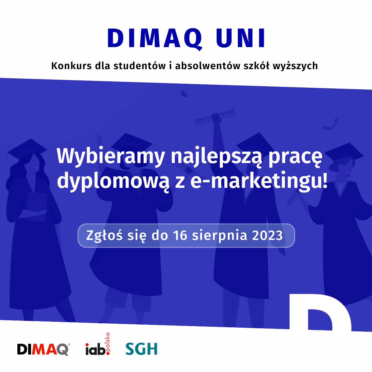 IAB Polska wraz z SGH zapraszają do udziału w prestiżowym konkursie DIMAQ Uni na najlepsze prace dyplomowe z marketingu internetowego. Organizowany już od 12 lat przez Związek Pracodawców Branży Internetowej IAB Polska oraz Szkołę Główną Handlową w Warszawie, konkurs ma na celu zwrócenie uwagi studentów i absolwentów na ogromny potencjał, jaki niesie ze sobą branża marketingu internetowego. DIMAQ Uni adresowany jest do autorów prac magisterskich, licencjackich, inżynierskich i podyplomowych. Zgłoszenia przyjmowane są do 16 sierpnia br.