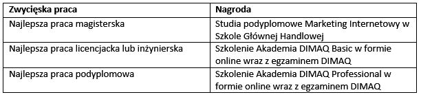 DIMAQ Uni to nie tylko szansa na wyróżnienie i prestiż, ale również szereg atrakcyjnych nagród. Laureat najlepszej pracy magisterskiej otrzyma możliwość podjęcia podyplomowych studiów z zakresu Marketingu Internetowego w Szkole Głównej Handlowej. Za najlepszą pracę podyplomową nagrodą jest udział w szkoleniu Akademia DIMAQ Professional w formie online, wraz z egzaminem DIMAQ. Natomiast autorzy najwybitniejszych prac inżynierskich lub licencjackich zostaną nagrodzeni uczestnictwem w szkoleniu Akademia DIMAQ Basic w formie online, również z egzaminem DIMAQ. Ponadto wyróżnieni uczestnicy konkursu będą mieli możliwość odbycia płatnych praktyk zawodowych u jednego z partnerów konkursu.