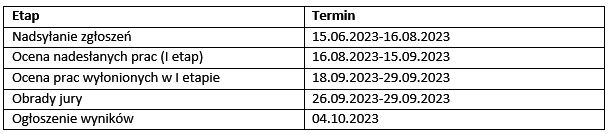 Aby wziąć udział w konkursie, wystarczy do 16 sierpnia 2023 r. przesłać zgłoszenie poprzez wypełnienie formularza dostępnego na stronie internetowej. Wraz z formularzem należy dołączyć plik PDF z pracą dyplomową, pamiętając o usunięciu informacji identyfikujących, takich jak imię i nazwisko autora, imię i nazwisko promotora oraz nazwa uczelni. Dodatkowo należy dołączyć skan dowolnego dokumentu z uczelni potwierdzającego pozytywną ocenę z obrony pracy dyplomowej (np. zaświadczenie z dziekanatu lub ksero dyplomu). Przed przystąpieniem do konkursu, uczestnicy muszą zaakceptować regulamin oraz wyrazić zgodę na przetwarzanie swoich danych osobowych. Pełny harmonogram konkursu został przestawiony w tabeli poniżej: