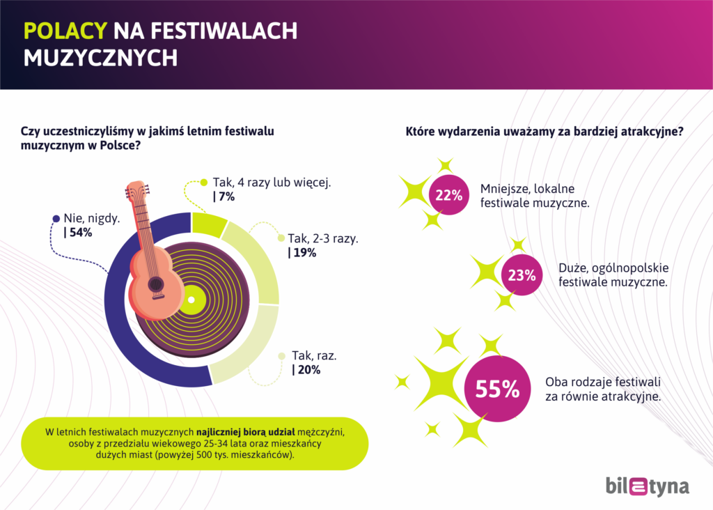 Jak się okazuje, w letnich festiwalach muzycznych w Polsce najliczniej uczestniczą mężczyźni, osoby z przedziału wiekowego 25-34 lata oraz mieszkańcy dużych miast, powyżej 500 tys. mieszkańców. Podczas tego typu imprez najważniejsza jest dla nas muzyka, atmosfera i możliwość dobrej zabawy – dopiero w dalszej kolejności plasuje się cena karnetu.