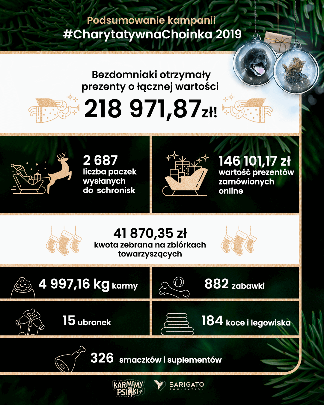 Akcji towarzyszyły zbiórki offlinowe i onlinowe, w wyniku których organizatorzy zebrali 41 870,35 zł na rzecz bezdomnych psiaków i kociaków.