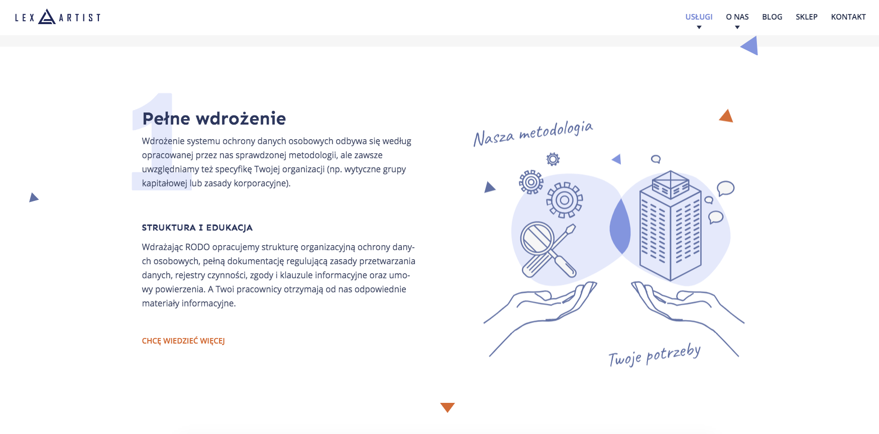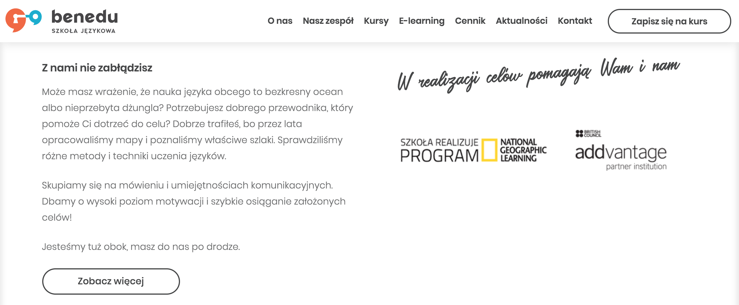 Znacznie bardziej ozdobne czy stylizowane na odręczne kroje możesz natomiast wykorzystać jako nagłówek lub do innych elementów pomocniczych: haseł, niedługich cytatów i dopisków. Oto dwa przykłady stron, gdzie zostało to wykorzystane: szkoła językowa oraz firma zajmująca się ochroną danych osobowych w biznesie.