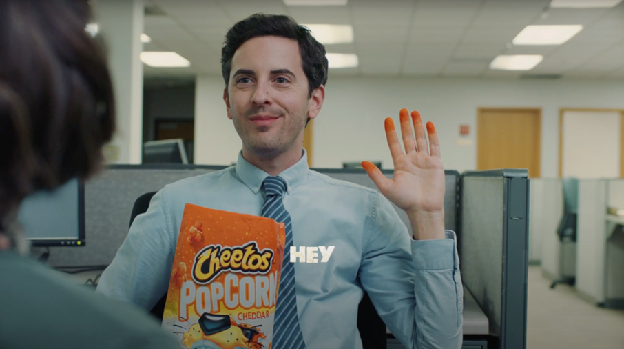 Reklama Cheetos, pokazująca zarówno produkt jak i branding + dodatkowo haczyk fabularny (zafarbowane palce bohatera) już w drugiej sekundzie. Ponadto bliski kadr na postać.