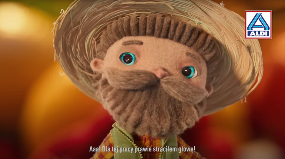 Maskotkowa brand persona, czyli Farmer Aldik w reklamie Aldi w ciasnym, idealnym do digitalu kadrze. A do tego wyraziste kolory oraz napisy dla osób oglądających spot bez dźwięku.