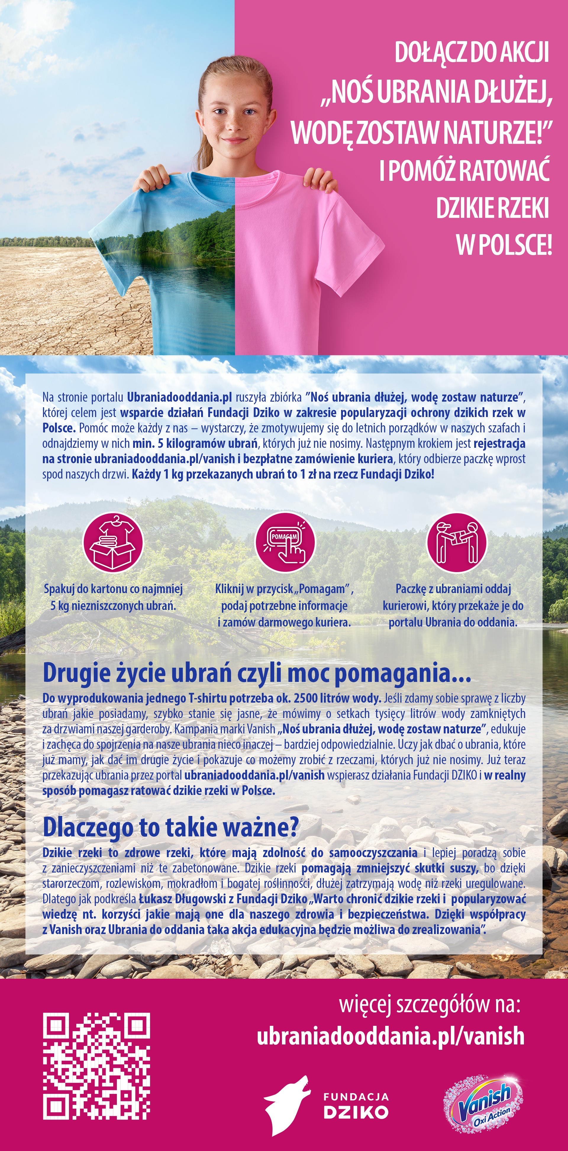 Do wyprodukowania jednego T-shirtu potrzeba ok. 2500 litrów wody. Jeśli zdamy sobie sprawę z liczby ubrań, które posiadamy, szybko stanie się jasne, że mówimy o setkach tysięcy litrów wody zamkniętych za drzwiami naszej garderoby. Kampania marki Vanish „Noś ubrania dłużej, wodę zostaw naturze”, edukuje i zachęca do spojrzenia na nasze ubrania nieco inaczej – bardziej odpowiedzialnie. Uczy jak dbać o ubrania, które już mamy, jak dać im drugie życie i pokazuje, co możemy zrobić z rzeczami, których już nie nosimy. Już teraz, przekazując ubrania przez portal ubraniadooddania.pl/vanish, wspierasz działania Fundacji DZIKO i w realny sposób pomagasz ratować dzikie rzeki w Polsce.
