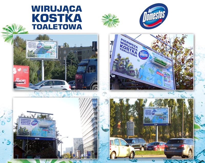 Od kilku dni na ulicach wybranych miast uwagę kierowców i przechodniów przyciągają oryginalne osiemnastometrowe tablice z wirującą kostką toaletową marki Domestos. Są one częścią kampanii wprowadzającej na rynek innowacyjny produkt marki.