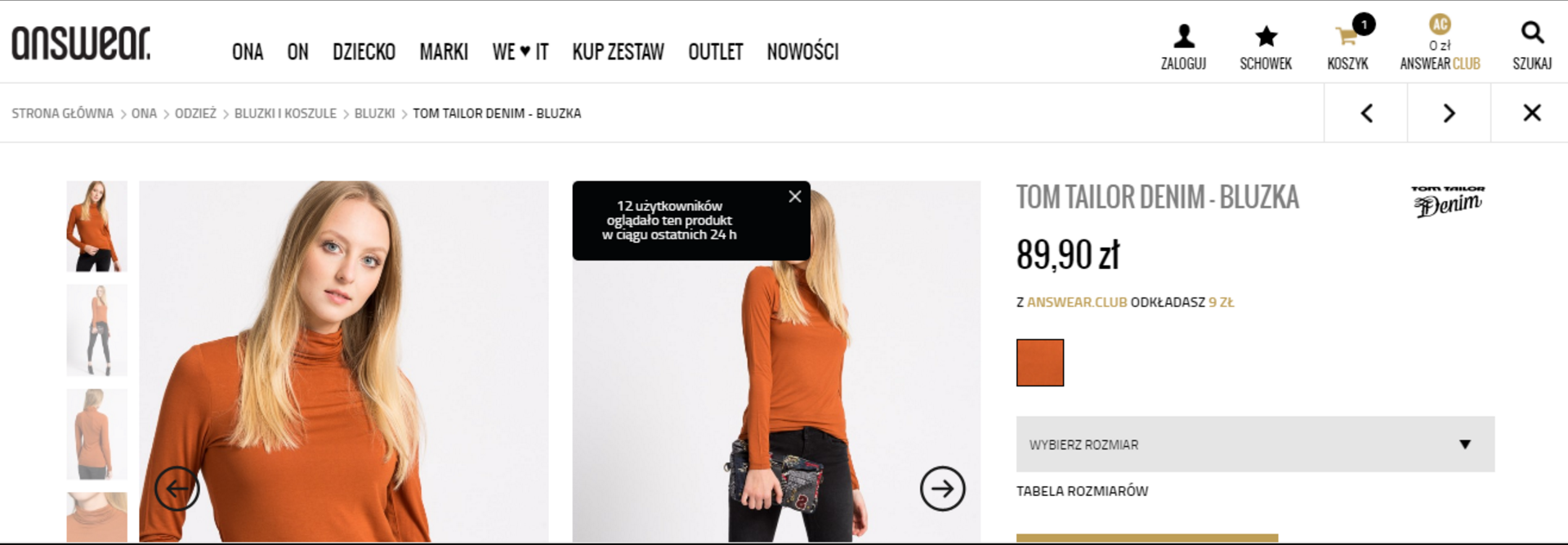Używając Insidera, Answear był w stanie zaimplementować mechanizm social proof na stronach produktów.
